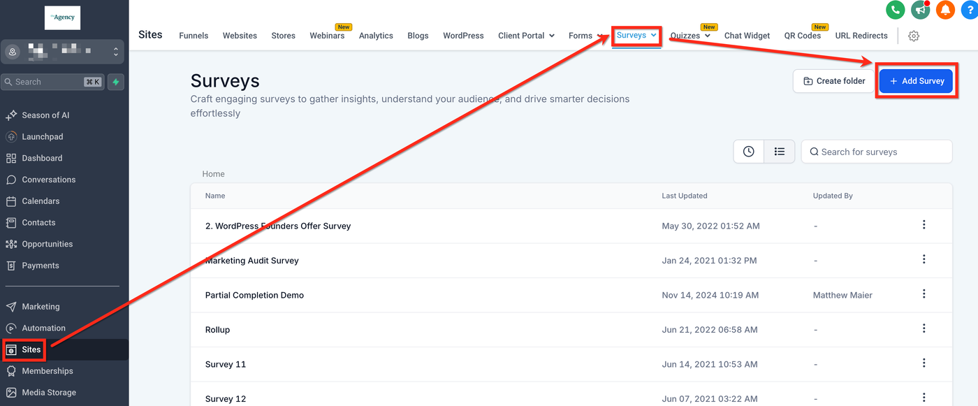 Navigieren Sie zu Sites > Survey > Builder > Add Survey.