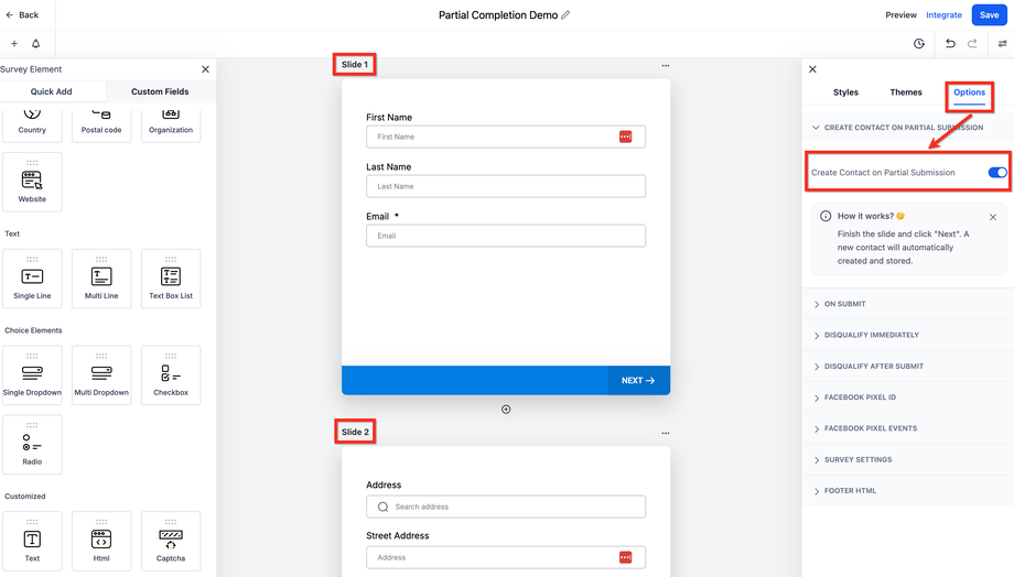 Einfache Einrichtung: Die Aktivierung der teilweisen Kontakt-Erstellung erfolgt direkt über das Options-Menü im Survey Builder. Dies verbessert die Erfassung wichtiger Kontaktdaten während des gesamten Umfrageprozesses.