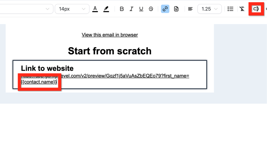 Du möchtest keinen statischen Wert hartkodieren, der eigentlich dynamisch sein soll. Stattdessen kannst du Merge-Felder in der URL einfügen, sodass beim Erstellen der E-Mail automatisch der Name oder ein anderer personalisierter Wert für jeden Kontakt eingesetzt wird.