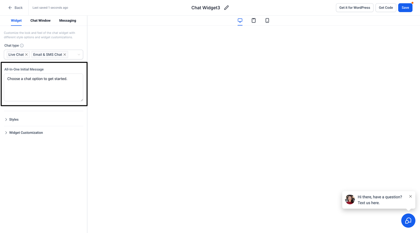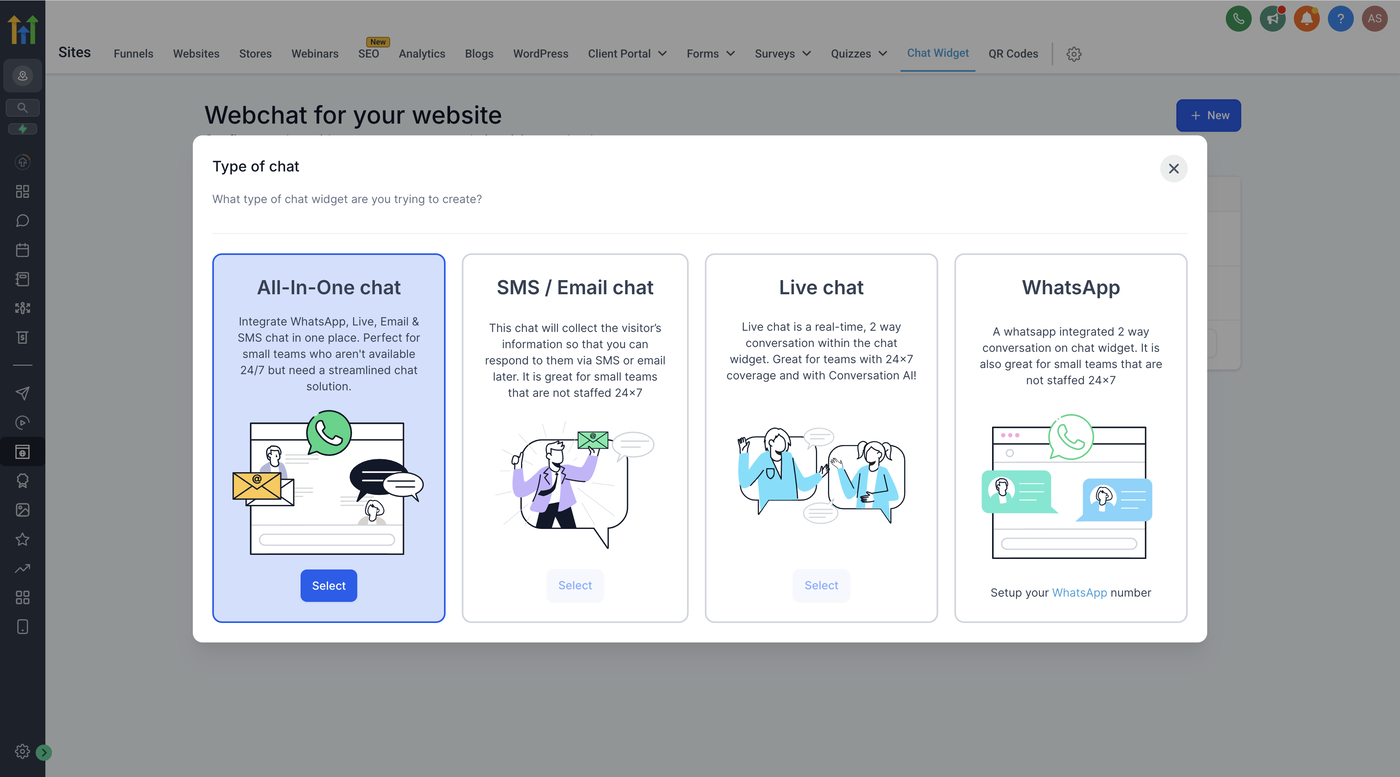 Erstelle ein neues Chat Widget und wähle All-in-One Chat aus der Liste der Chat-Typen.