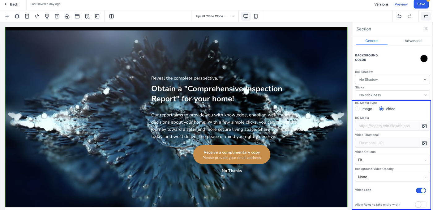 Wählen Sie den Abschnitt aus. Ändern Sie auf der rechten Seite in den Einstellungen den BG-Medientyp auf Video und wählen Sie das Video aus der Media Library aus. Klicken Sie auf das Vorschau-Symbol, um zu sehen, wie die Seite in Ihrem Browser aussieht.
