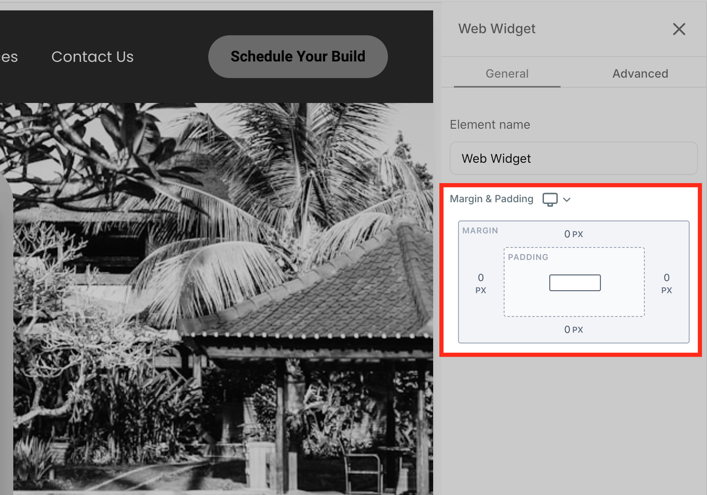 Klicken Sie auf das Widget, um die Einstellungen zu ändern. Sie können z. B. Margins, Padding oder Visibility anpassen.