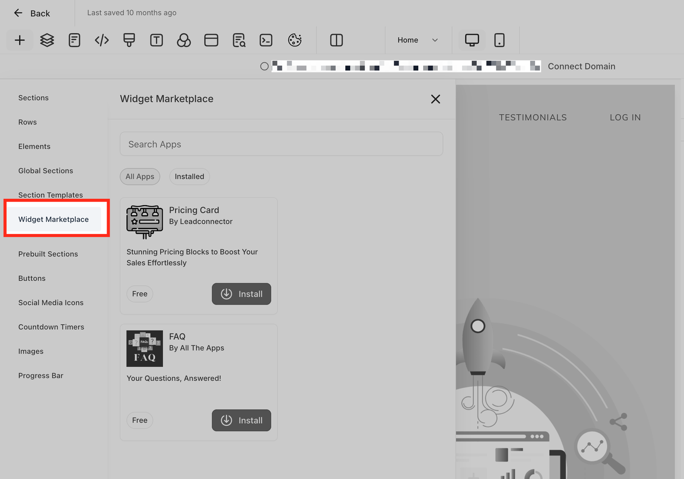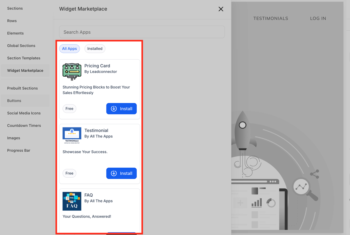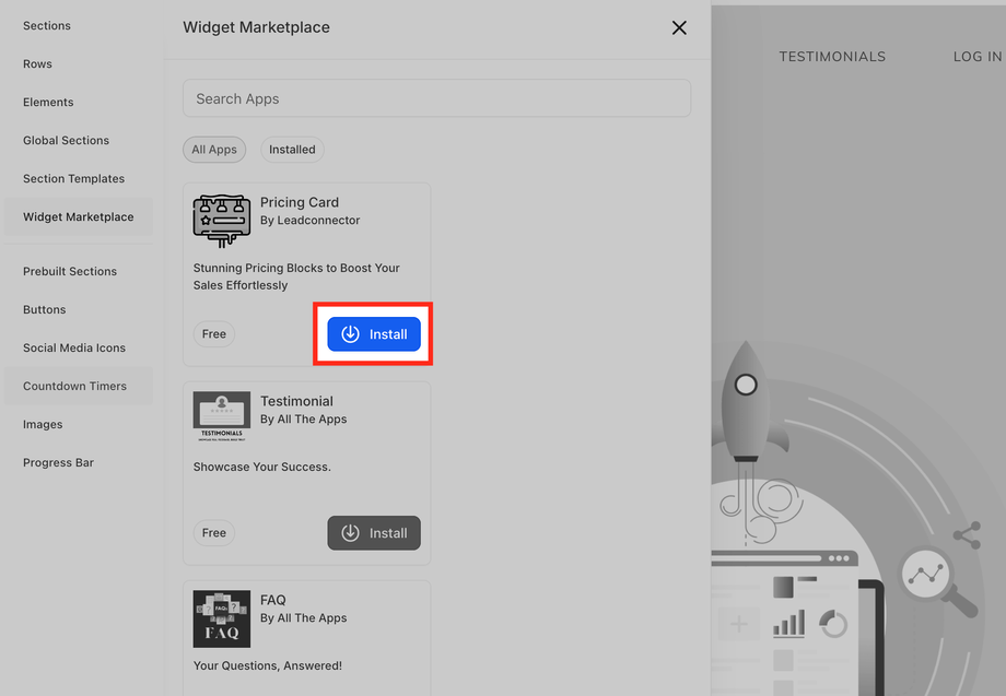 Der Web Widget Marketplace ist wie ein App Store, aber für kleine Website-Add-ons oder „Widgets“. Widgets sind Tools, die Sie auf Ihrer Funnel-/Website-Seite hinzufügen können, z. B. Pricing Cards, um Preisdetails anzuzeigen, Banners für Ankündigungen oder andere interaktive Elemente. Durch das Hinzufügen von Widgets können Sie Ihre Seite ansprechender gestalten, Conversions steigern und das Erlebnis Ihrer Besucher verbessern – ganz ohne fortgeschrittene Programmierkenntnisse.