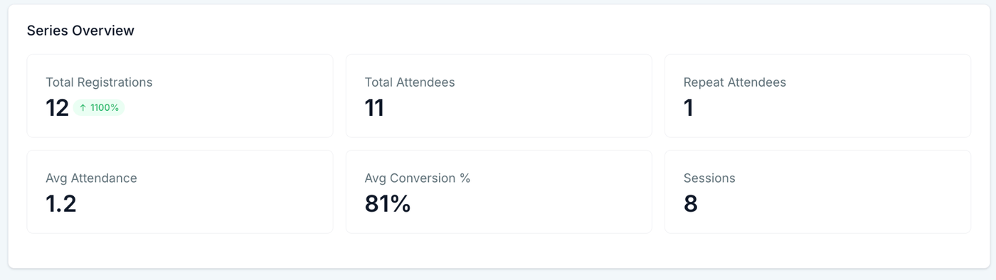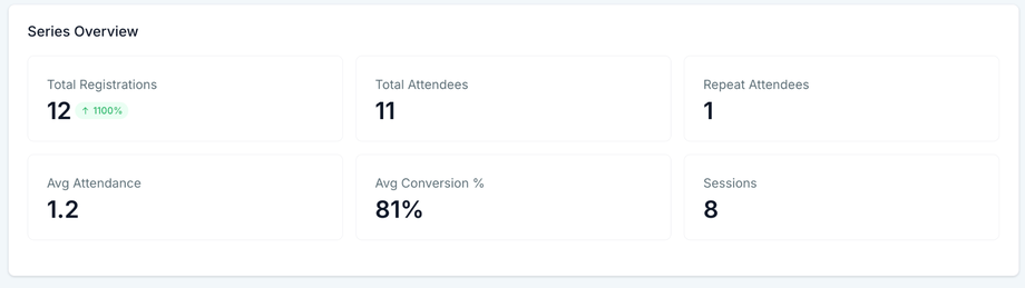 Serienübersicht: Registrierungen, Teilnehmer, wiederkehrende Teilnehmer, durchschnittliche Teilnahmequote, durchschnittliche Conversion-Rate, Anzahl der Sessions