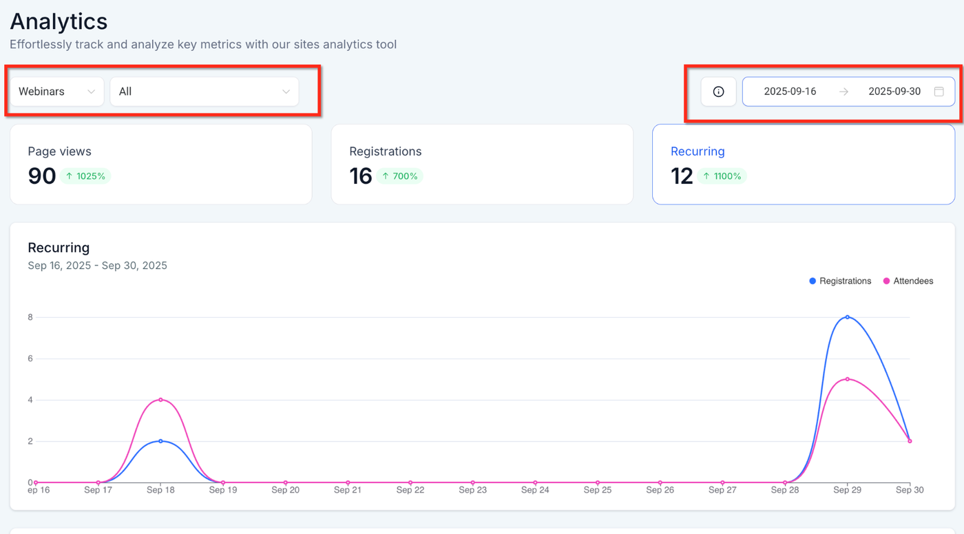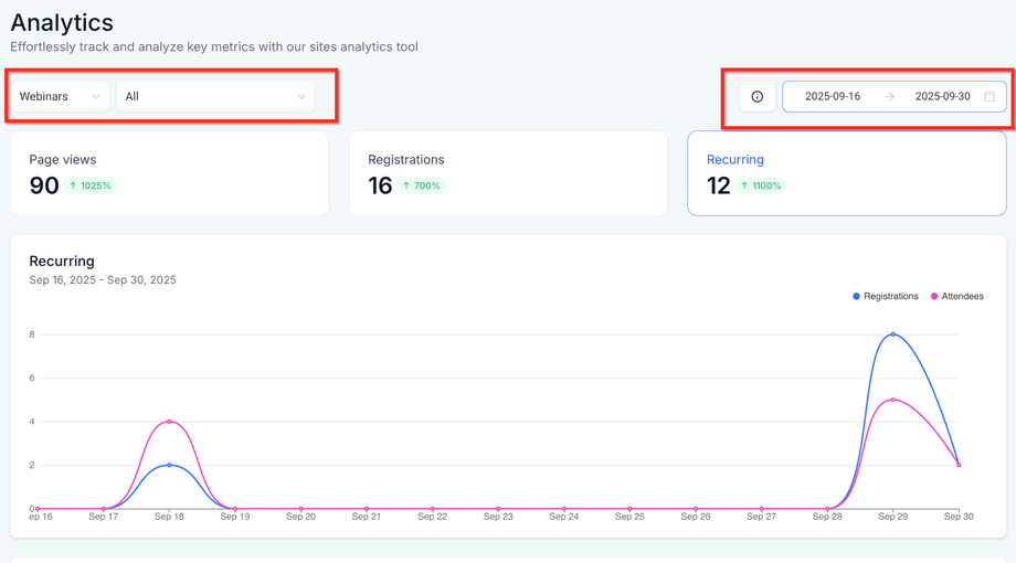 Gehe zu Sites → Analytics → Webinars. Wähle den Tab On-Demand, Live oder Recurring und setze den gewünschten Zeitraum im Filter oben rechts.