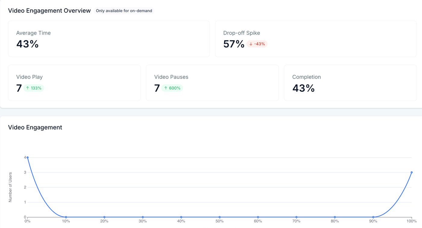 Webinar-Video-Analytics bringt datenreiche Dashboards für deine Live-, On-Demand- und wiederkehrenden Webinare, sodass du genau sehen kannst, wo Zuschauer abspringen, welche Sessions am besten performen und wie du Timing und Inhalte für maximale Conversions optimierst.