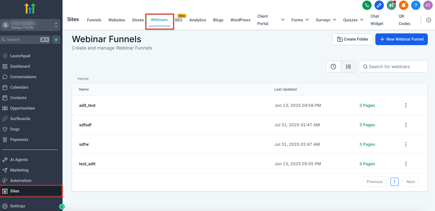 Erstelle oder importiere dein Webinar (Live, On-Demand oder wiederkehrend) unter Sites → Webinars.