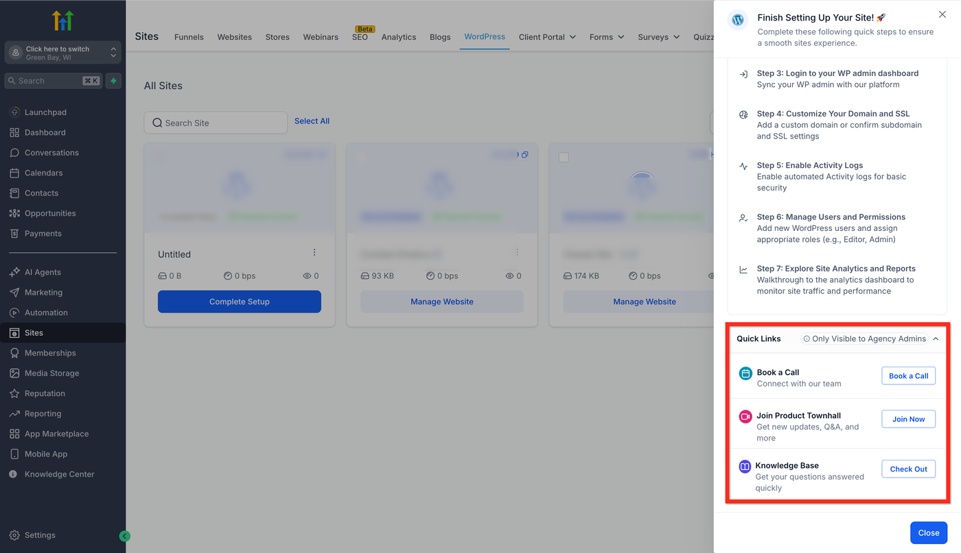Nur Agency Admins können die Quick Links im WordPress Setup Guide sehen.