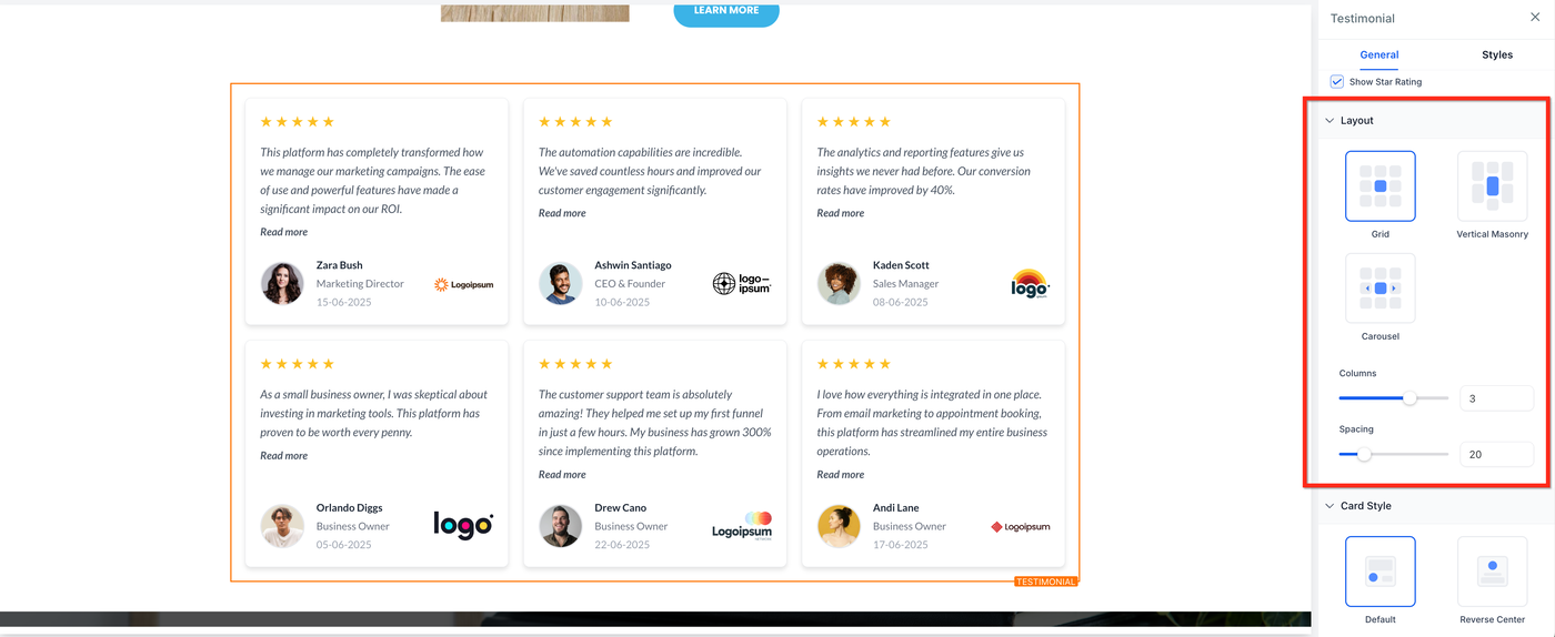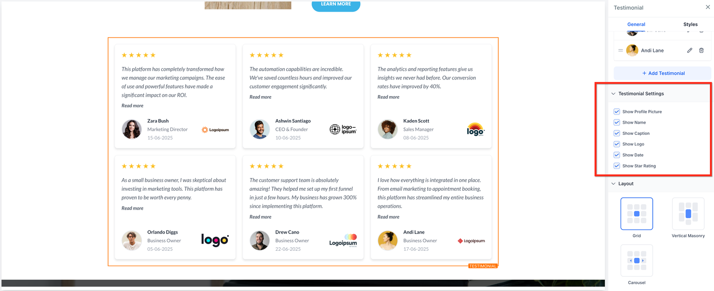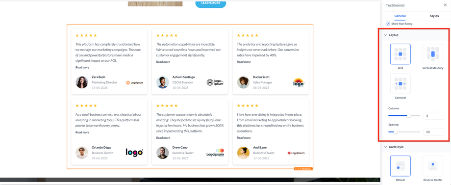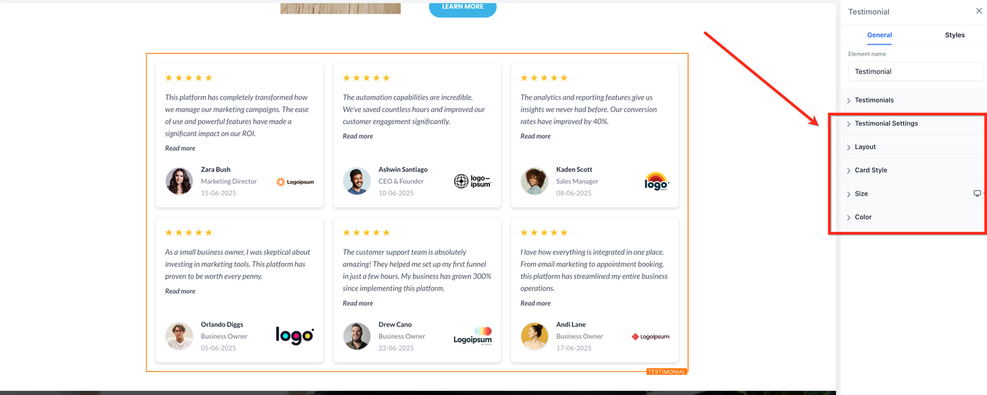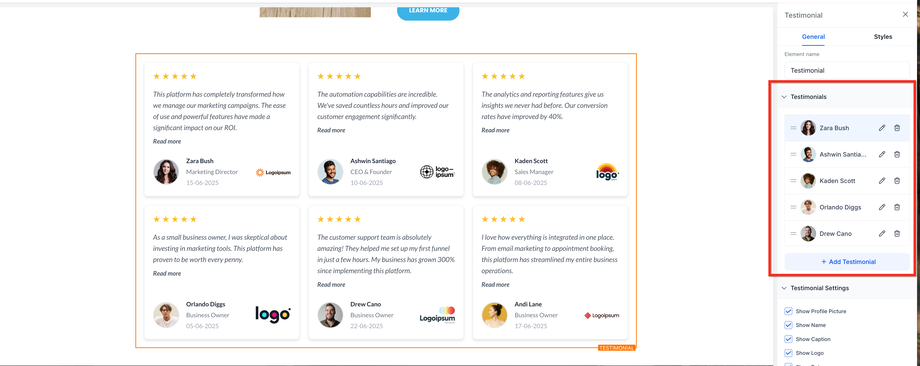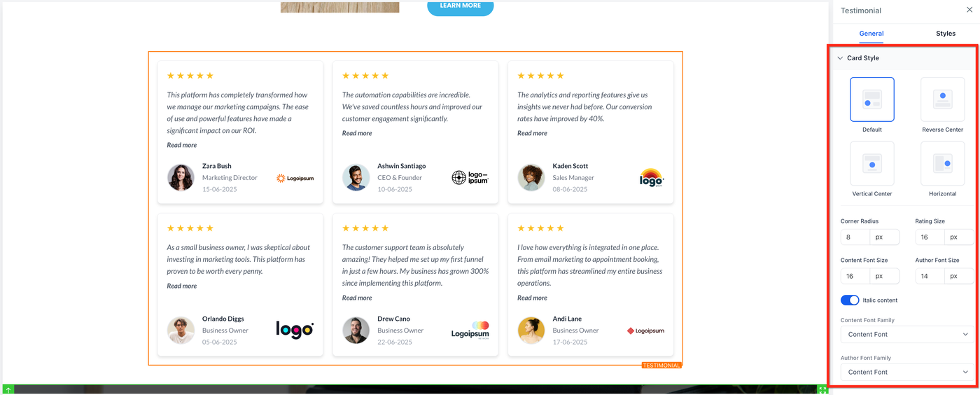 Das Testimonial-Element erlaubt es, Kundenfeedback direkt auf Funnel- oder Website-Seiten anzuzeigen. Es bietet flexible Layouts, Kartenformate und Inhaltseinstellungen, sodass du Vertrauen aufbauen und deine Marke stärken kannst, indem du echte Erfahrungen zufriedener Kunden präsentierst.