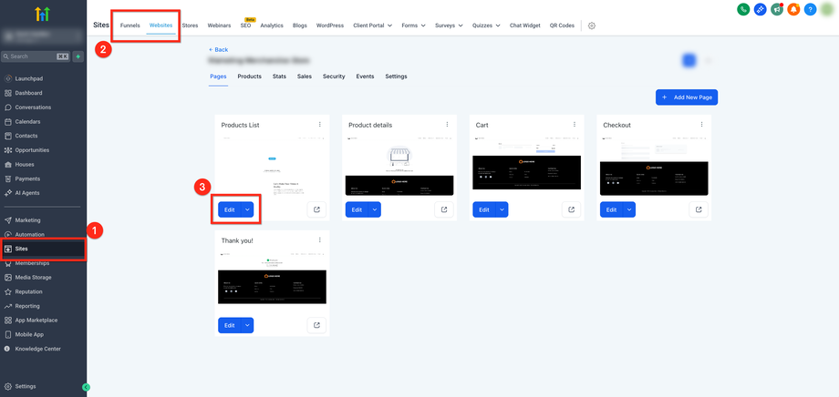 Funnel oder Websites Tab auswählen