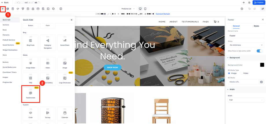 Testimonial-Element per Drag & Drop auf die Seite ziehen