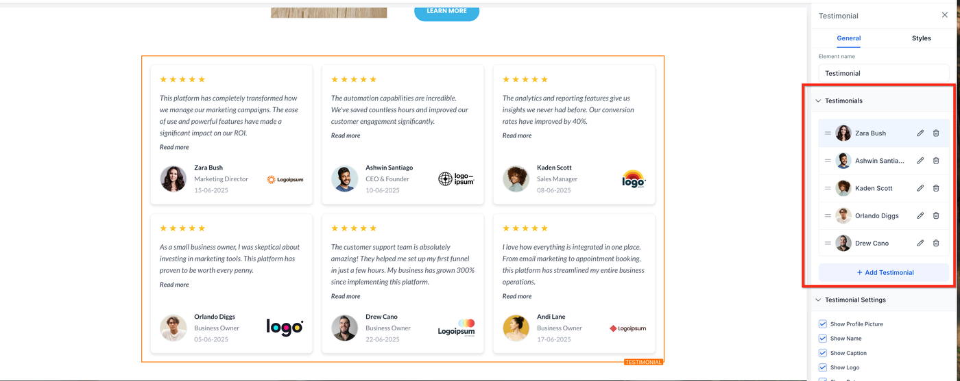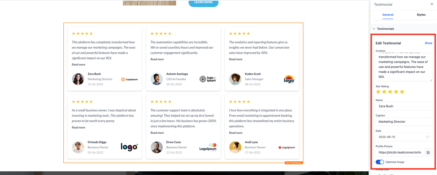 Das Testimonial-Element im HighLevel Funnels- & Websites-Builder ermöglicht es dir, professionelle, markenkonforme Kundenbewertungen auf jeder Seite einzufügen. Dieser Leitfaden erklärt, was das Testimonial-Element ist und wie du es passend zu deiner Marke einrichtest.
