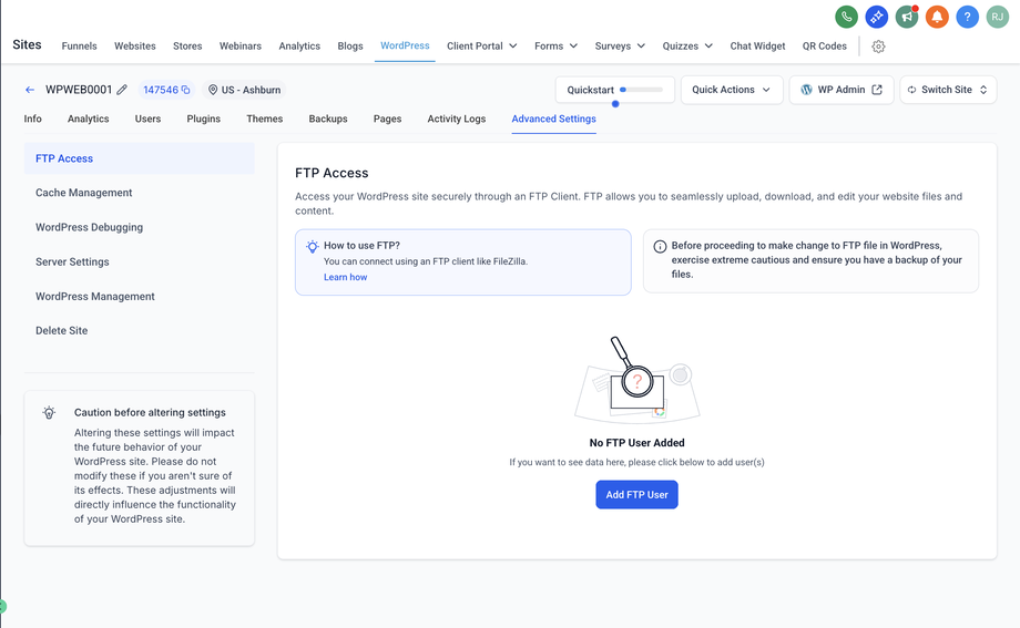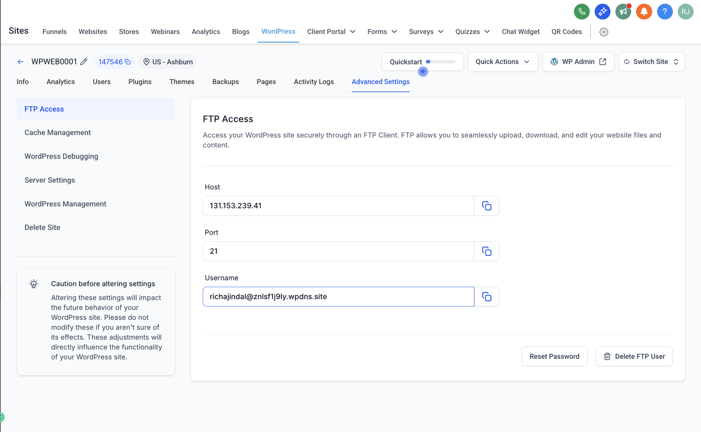 Bevor du dich über FTP verbindest, benötigst du diese Daten aus deinem WordPress Hosting Dashboard (unter Sites → WordPress → Advanced Settings → FTP Access):
