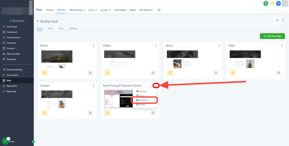 Um ein Produkt zu einer Website hinzuzufügen, klicke auf die 3 Punkte auf der Website-Seite, auf der sich dein Bestellformular befindet.