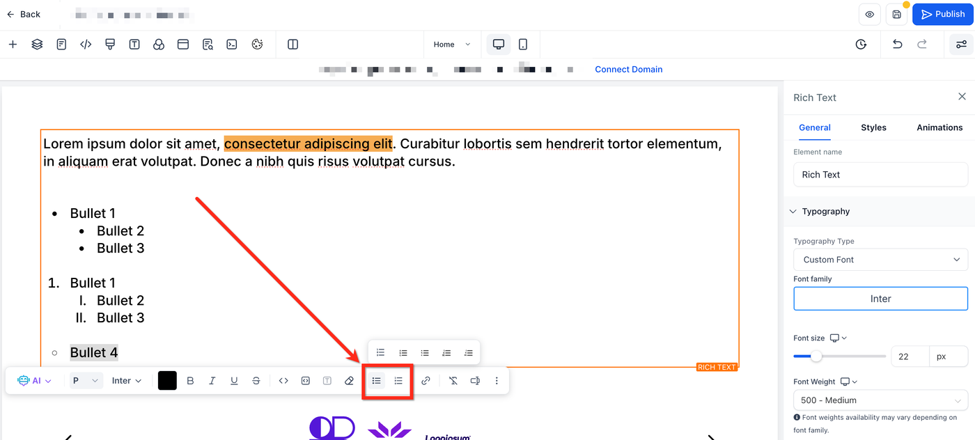 Das Rich-Text-Element bietet erweiterte Formatierungsfunktionen direkt im Editor. In einem einzigen Textfeld kannst du Überschriften, Blockzitate, Inline-Code, verschachtelte Listen und Text-Hervorhebungen nutzen.