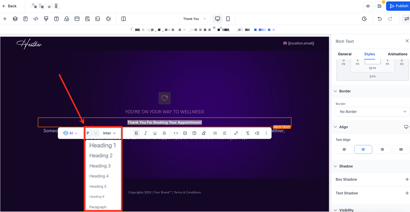 Überschriften-Tags ändern (H1, H2, …) in Funnels/Websites