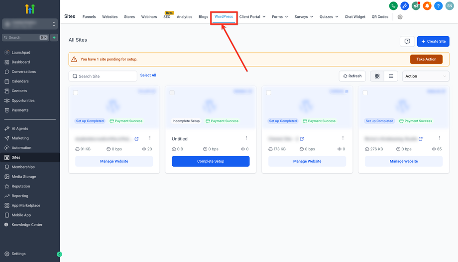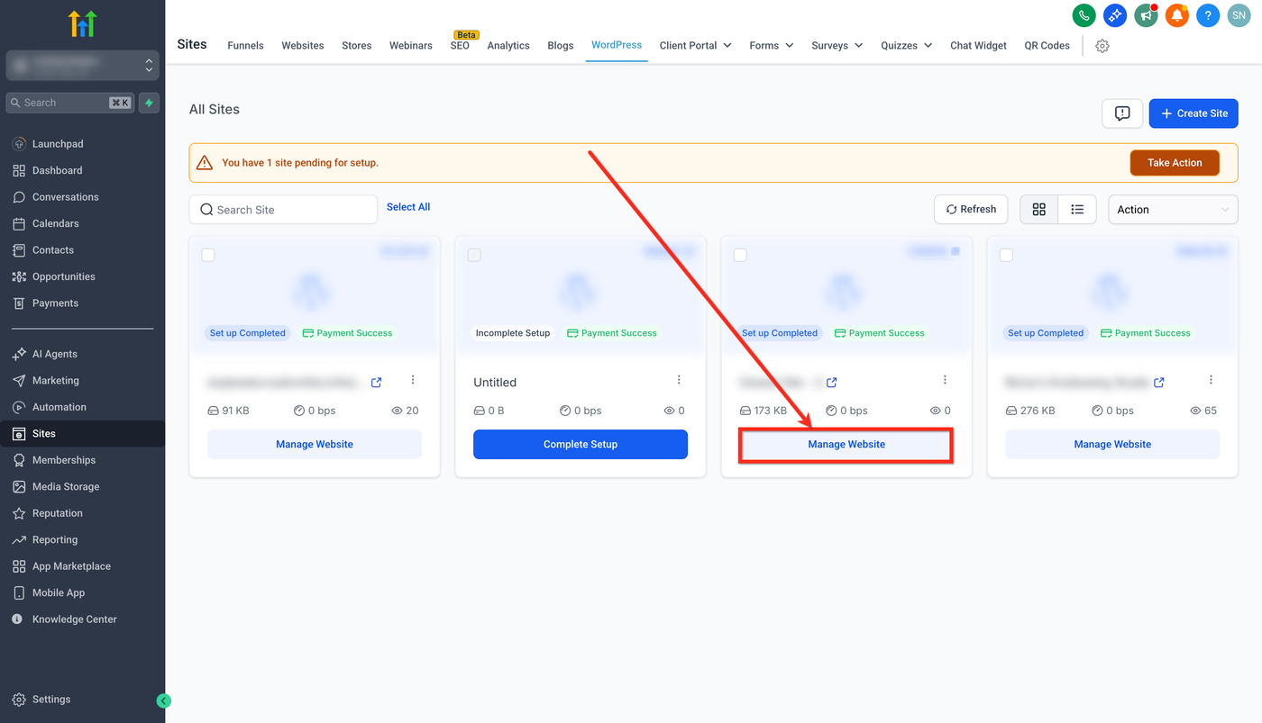 Klicken Sie auf Manage Website für die Website, deren Indexierung Sie deaktivieren möchten.