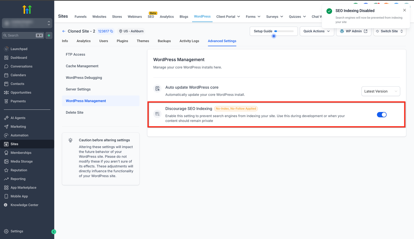 Schalten Sie den Discourage SEO Indexing-Schalter auf ON, um die Indexierung durch Suchmaschinen zu verhindern.