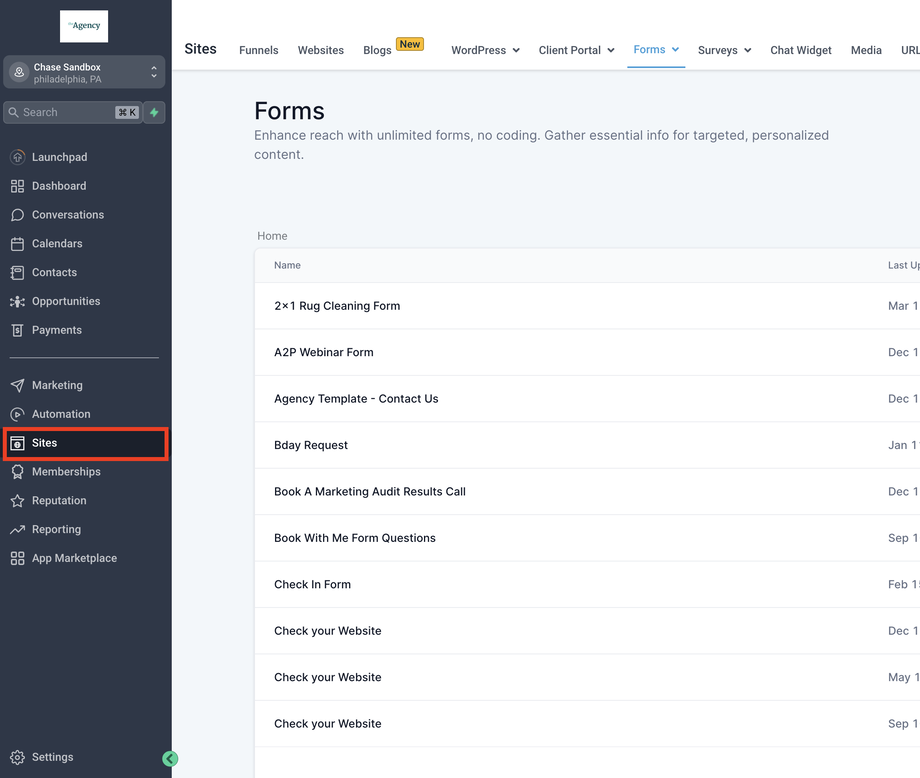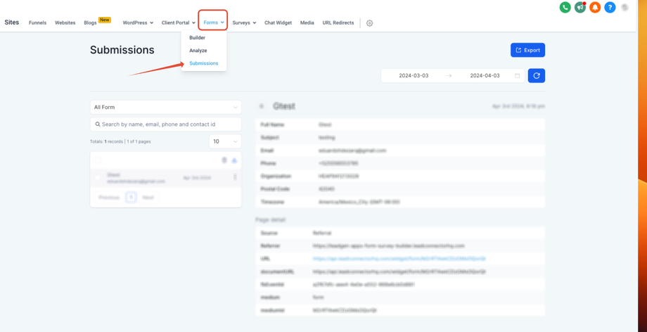 Formulare helfen dir, Informationen von Kontakten zu erfassen, die das Formular ausfüllen und absenden. Um diese Informationen einzusehen, gehe zu Sites → Forms (oben im Bildschirm) → Submissions. Dort kannst du Formulareinsendungen filtern oder durchsuchen und die Informationen zu einer bestimmten Einsendung einsehen.