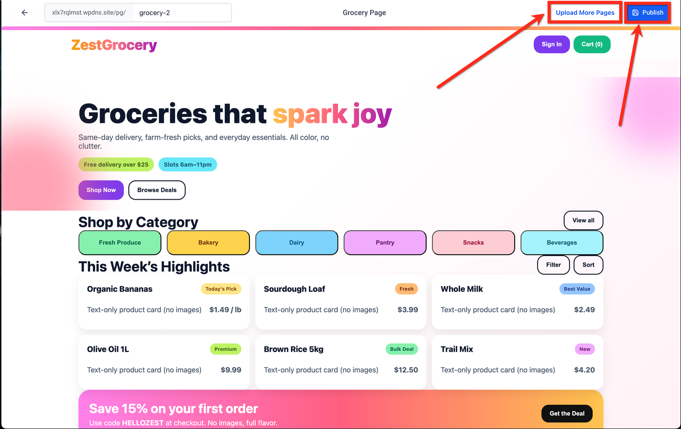 Geben Sie einen Seitennamen (z. B. „Grocery Page“) und einen Custom Site Slug (z. B. /grocery-3) ein.