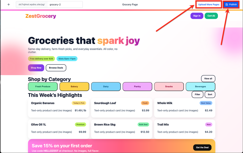 Sobald alles bereit ist, klicken Sie auf Publish, um Ihre HTML-Seite live zu schalten.