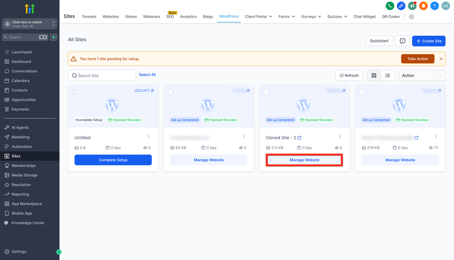 Klicken Sie auf Manage Website für die WordPress-Seite, auf der Sie Ihre HTML-Datei hochladen möchten.
