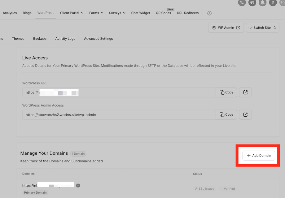 Klicken Sie im Bereich „Manage Your Domains“ auf „Add Domain“.