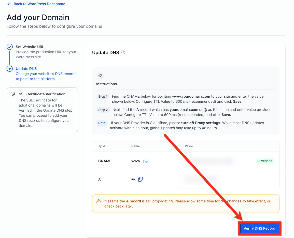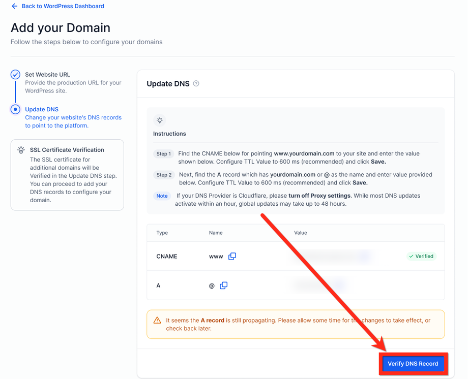 Nach Verfügbarkeit die bereitgestellten CNAME- und A-Einträge hinzufügen und auf Verify DNS Records klicken.