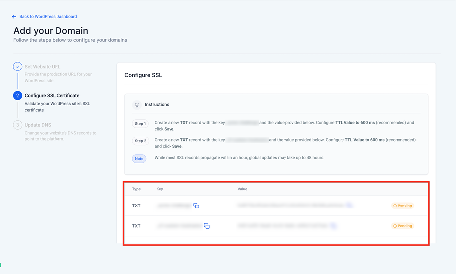 Das Hinzufügen einer Subdomain funktioniert ähnlich wie bei einer Domain. SSL wird beim Schritt Update DNS überprüft, sodass TXT-Einträge nicht erforderlich sind.