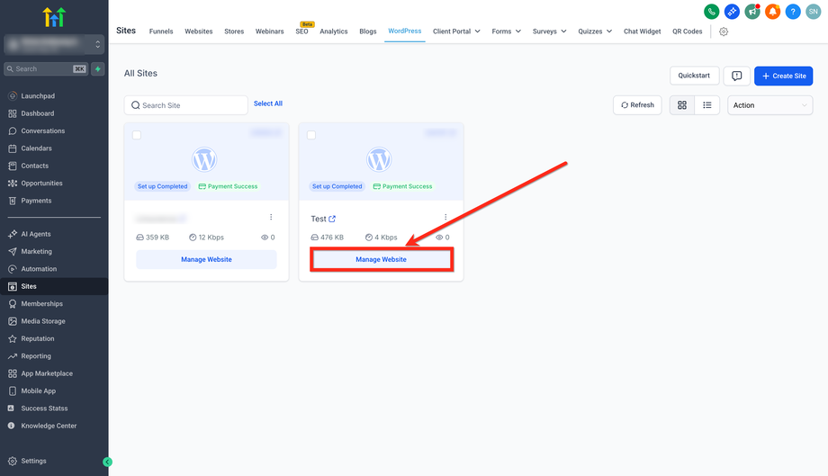 Klicke auf Manage Website bei der Site, für die du die Domain hinzufügen möchtest.