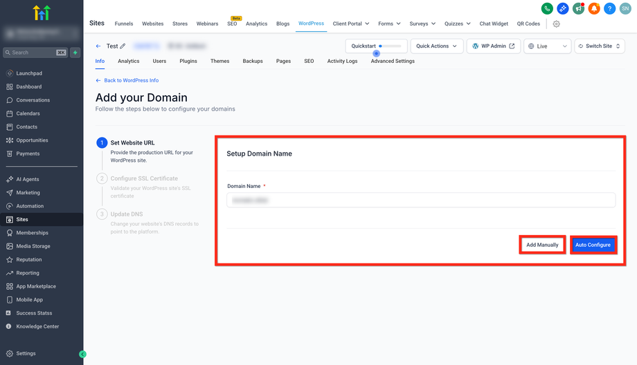 Wähle Auto Configure oder Add Manually. Das System überprüft automatisch, ob die Domain bereits mit einer anderen Location oder Agentur verbunden ist.