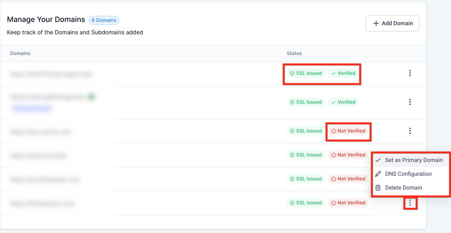 Domain Management: Bis zu 5 Domains oder Subdomains hinzufügen. Eine als primäre Domain festlegen.
