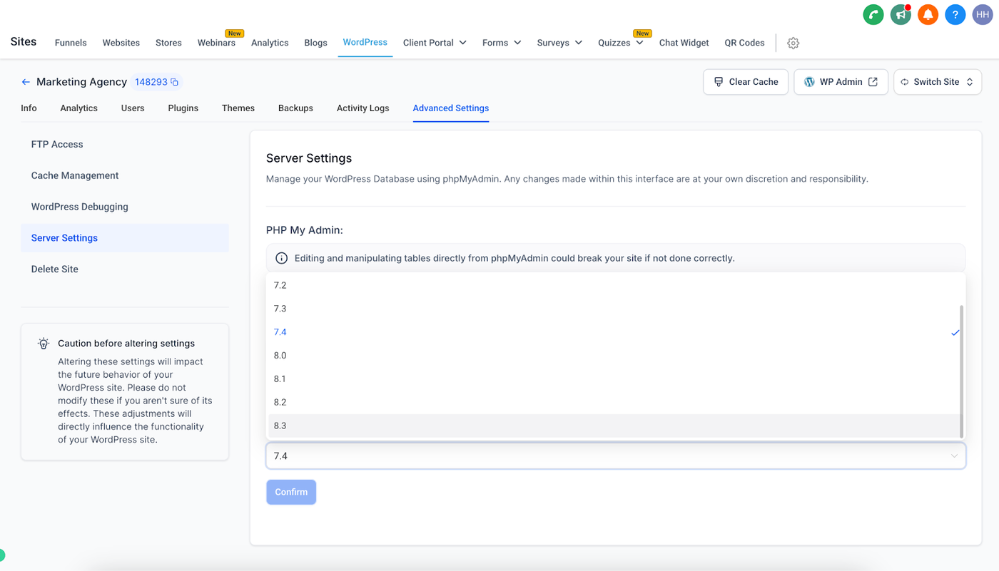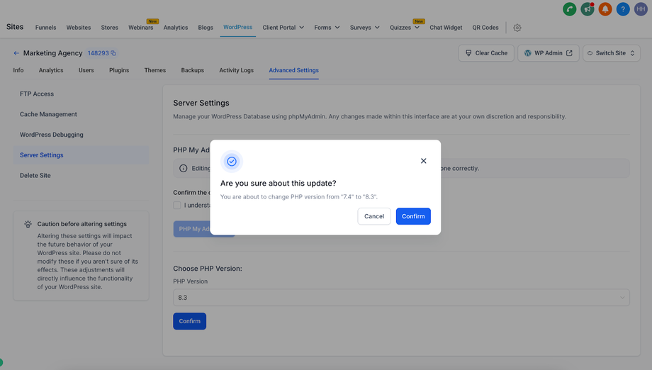 Klicken Sie auf Confirm. Ihre Website wird automatisch auf die ausgewählte PHP-Version aktualisiert.