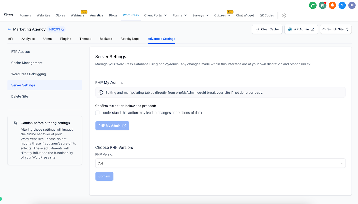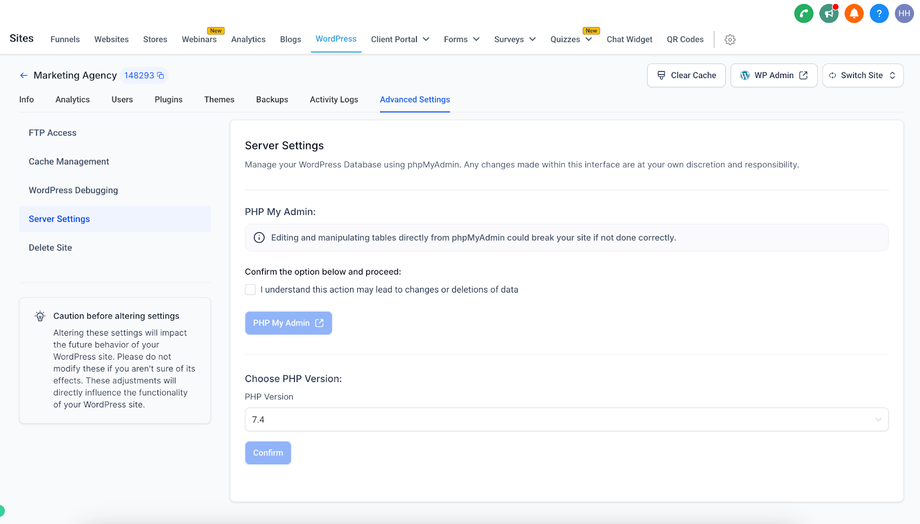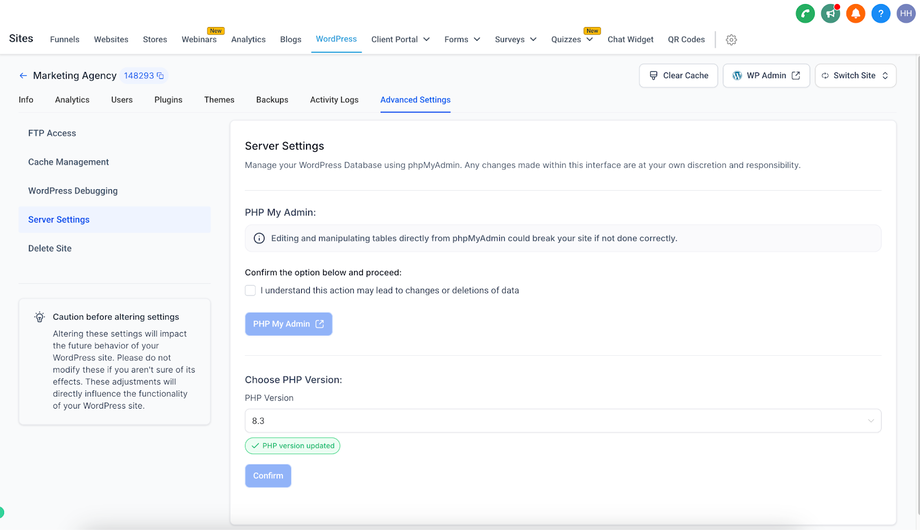 Die Verwaltung der Performance und Sicherheit Ihrer WordPress-Website war noch nie so einfach. Mit der Funktion PHP Version Update in den Advanced Settings haben Sie nun volle Kontrolle darüber, welche PHP-Version Ihre Website verwendet – für bessere Sicherheit, höhere Kompatibilität und schnellere Performance.