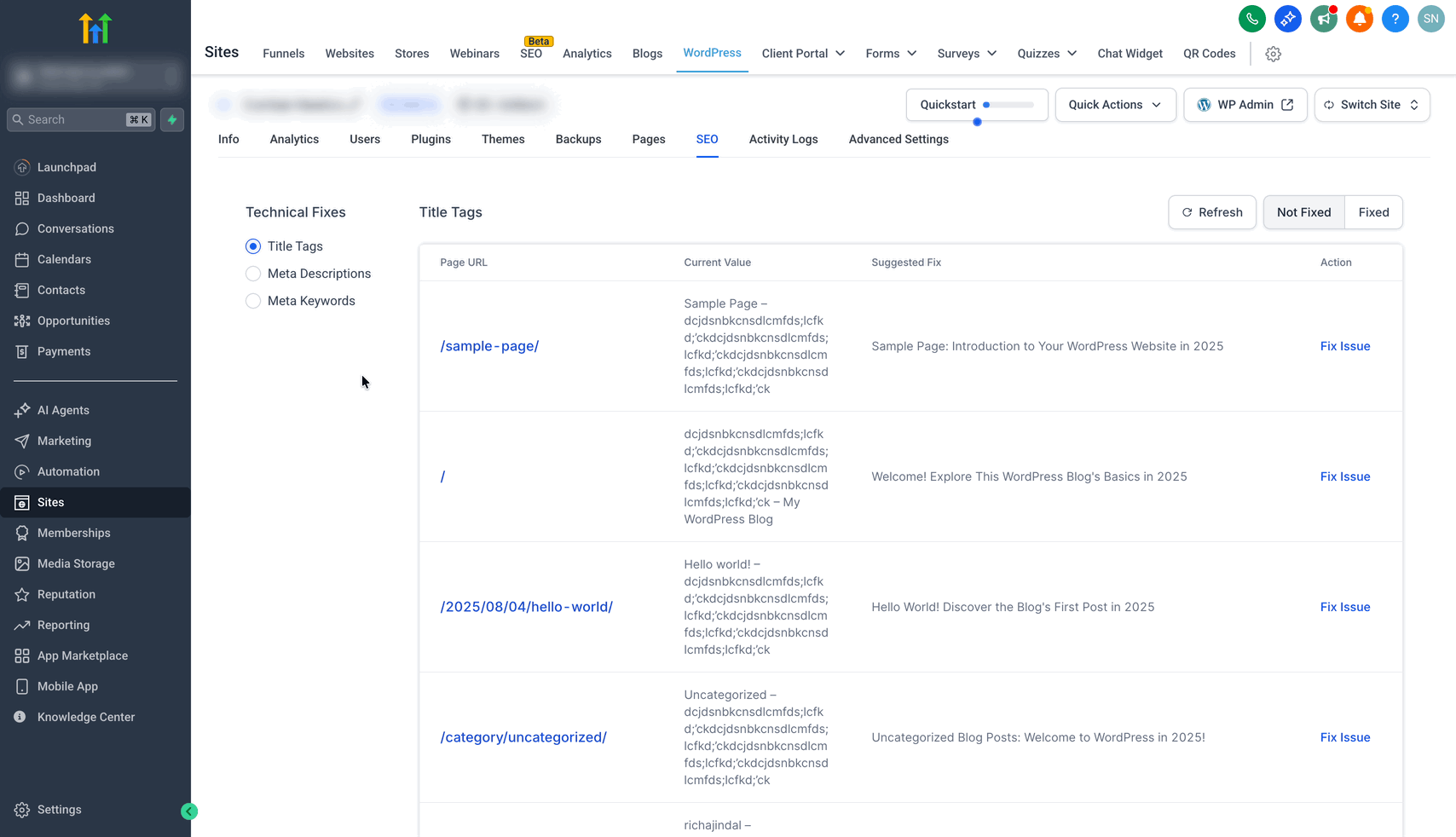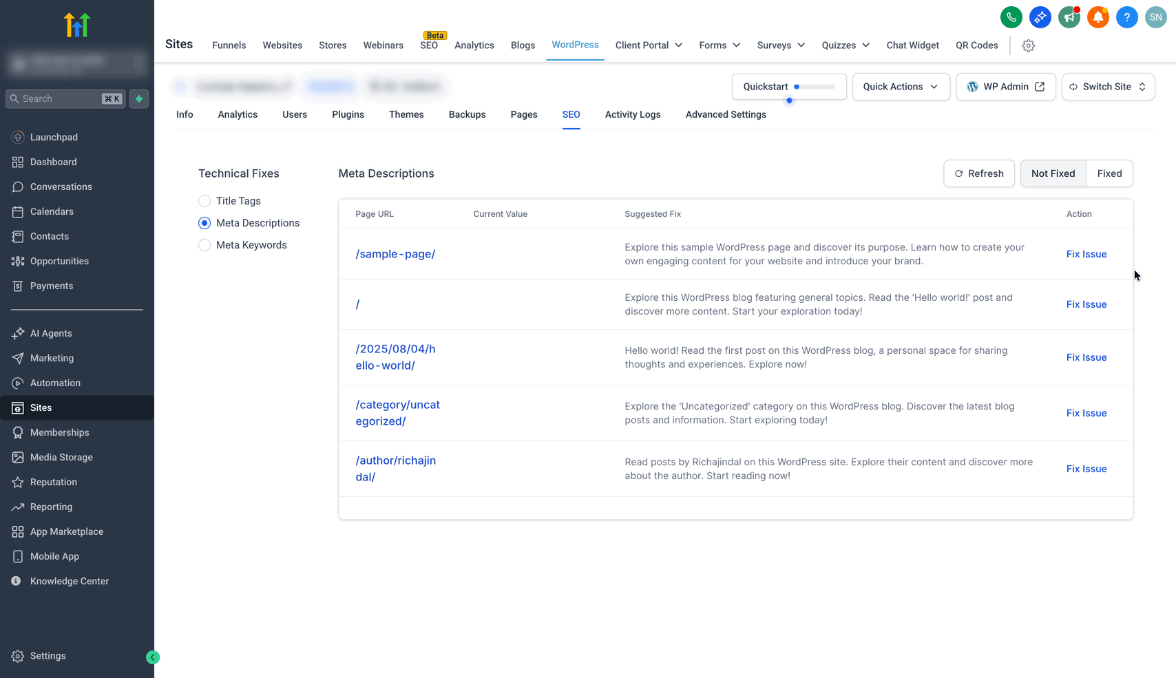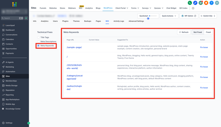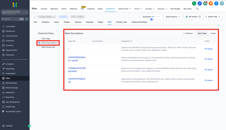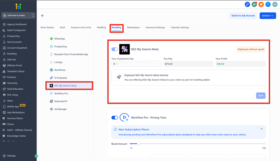 Überprüfung: Agency View → Sub-accounts → Manage Client → Reselling → SEO