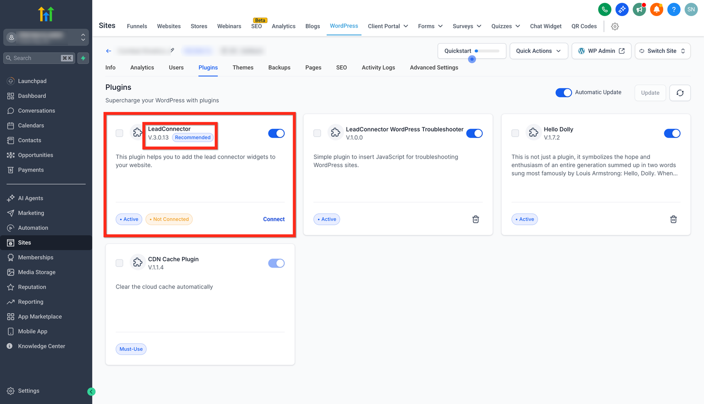 Das LC (LeadConnector) WordPress Plugin Version 3.0.12 oder höher muss installiert und aktiv sein.