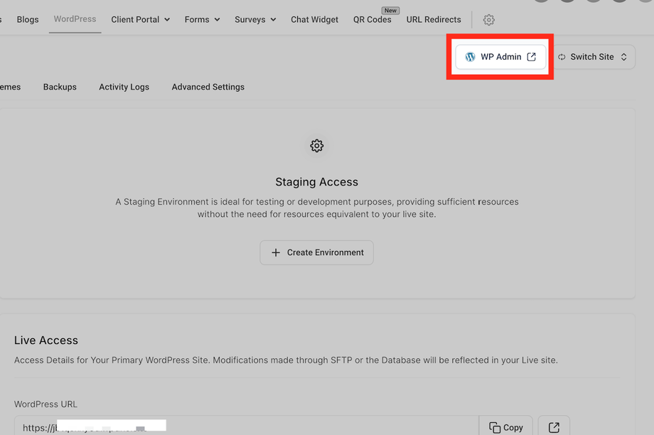Der „WP Admin“-Button macht es sehr einfach, sich mit nur einem Klick in Ihr WordPress-Admin-Panel einzuloggen – direkt aus Ihrem WordPress-Dashboard heraus.