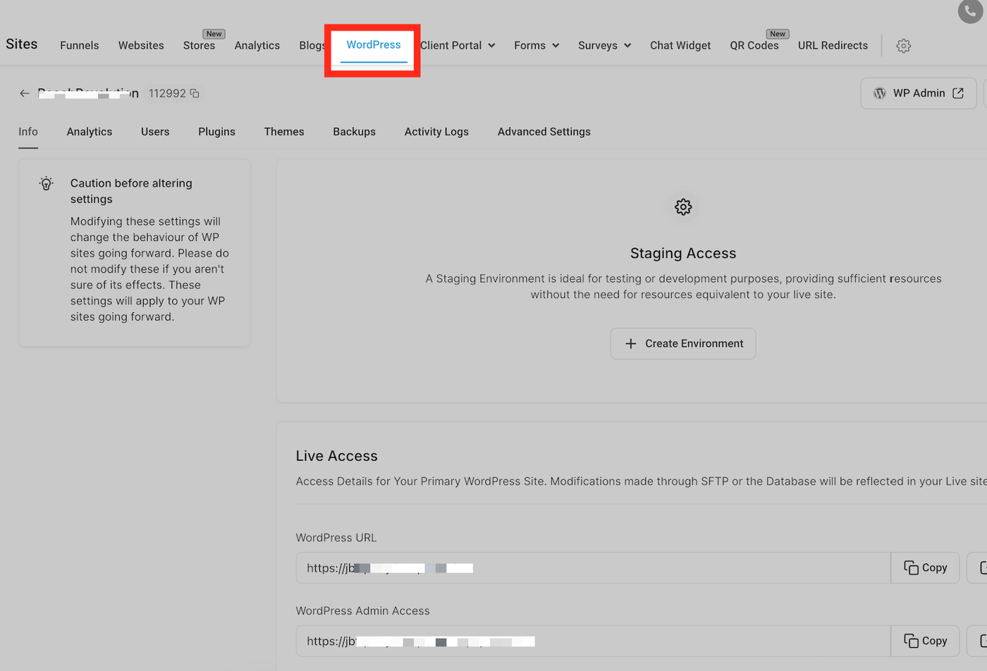 Neben jeder Website sehen Sie einen „WP Admin“-Button.