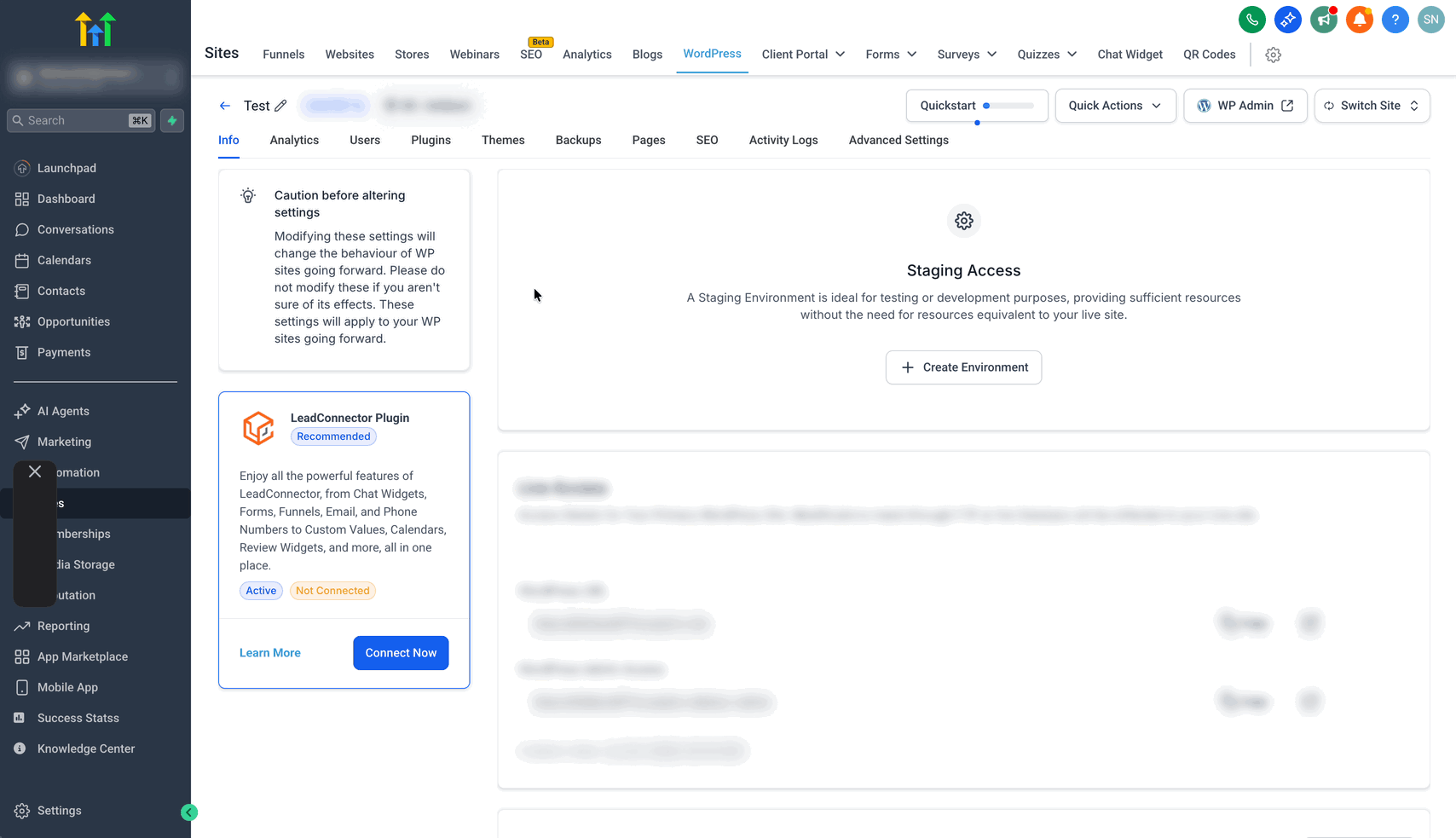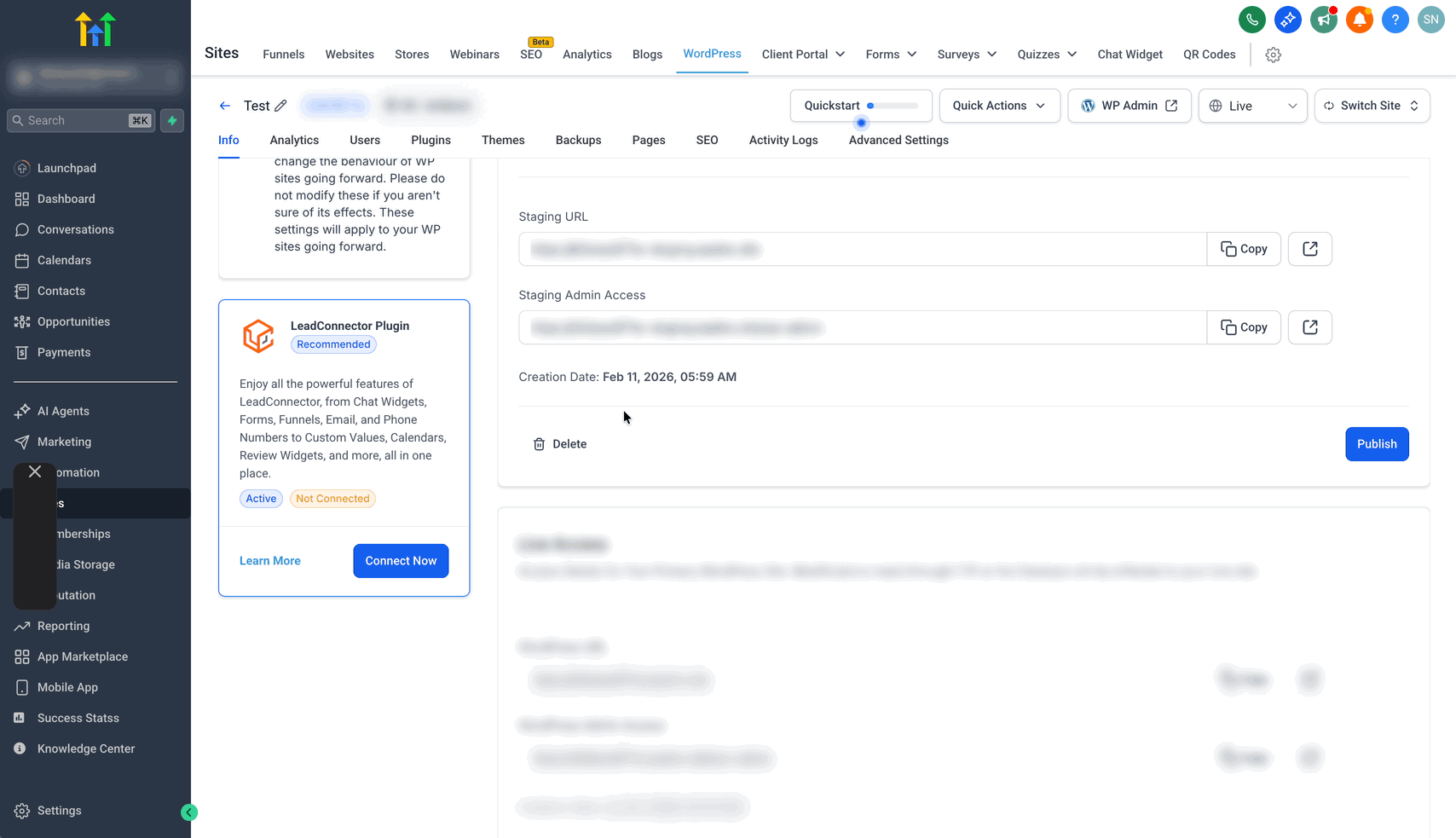 Hinweis: Stelle sicher, dass das WordPress Hosting Abonnement für die Location / den Sub-Account aktiviert ist.