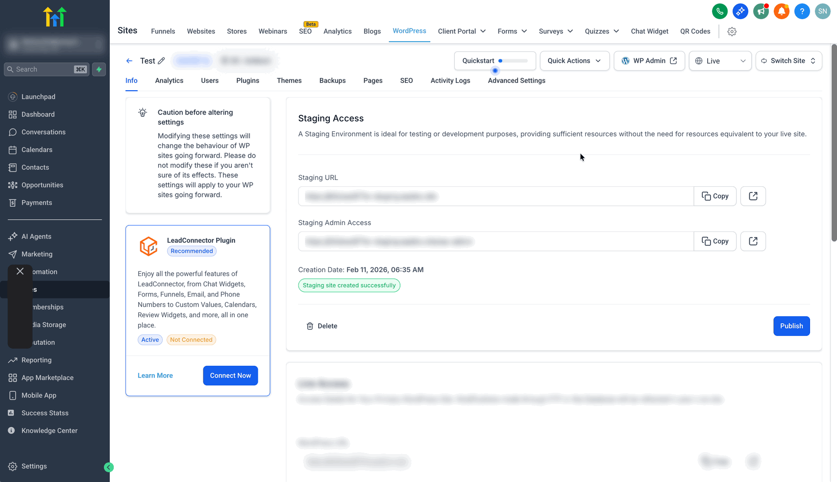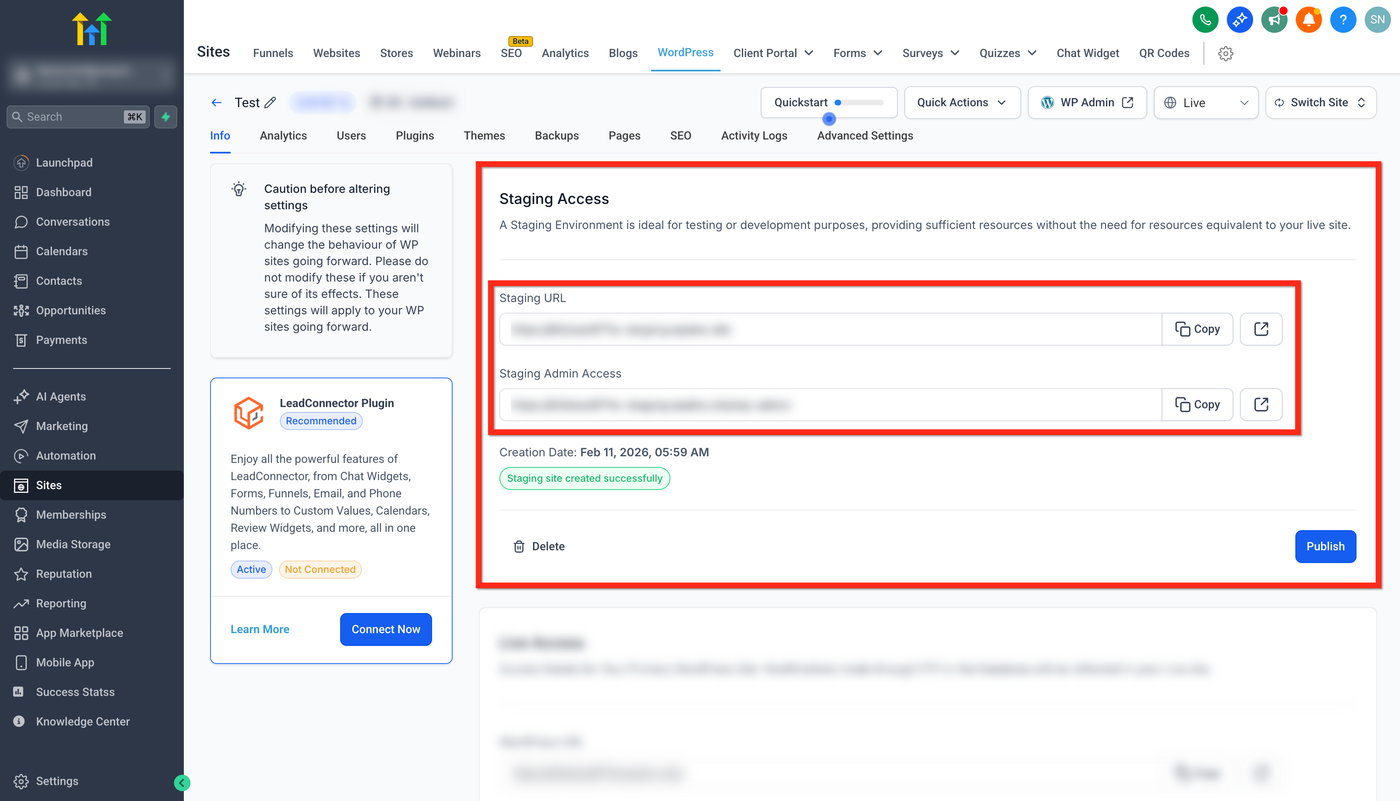 Sobald der Vorgang abgeschlossen ist, siehst du die Staging URL, den Staging Admin Access (um auf die Staging-Site zuzugreifen und Änderungen vorzunehmen) sowie weitere Details.