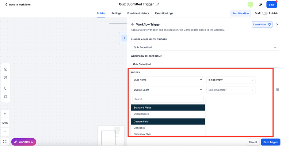 Wähle Quiz Submitted aus der Liste der verfügbaren Trigger.