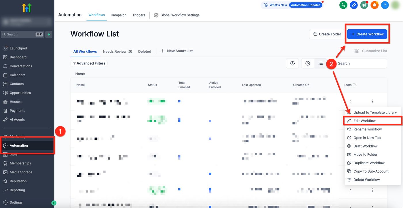 Klicke auf Create Workflow oder bearbeite einen bestehenden Workflow über das 3-Punkte-Symbol und Edit Workflow.