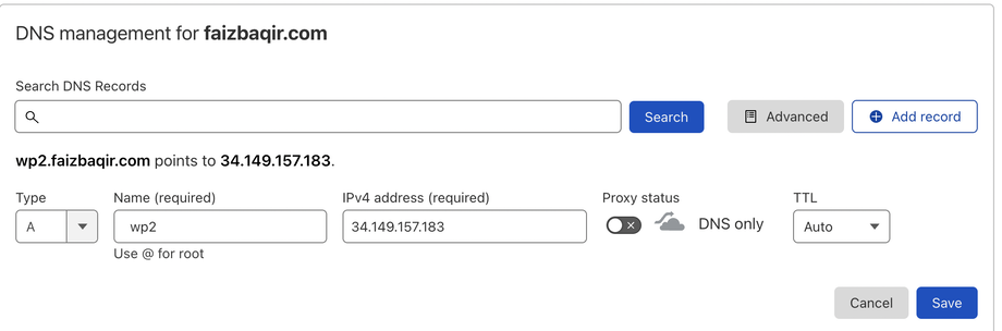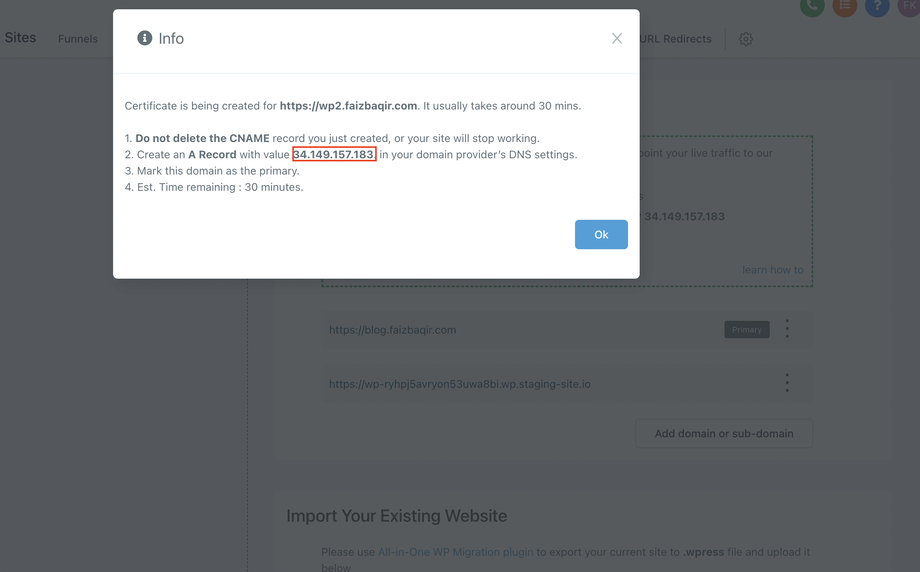 Kopiere den Wert aus dem Popup und erstelle einen A-Record in den Domain-Einstellungen deines Providers.