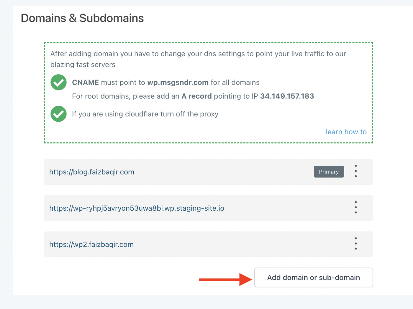 Schritt 1: Auf „Add domain or sub-domain“ klicken