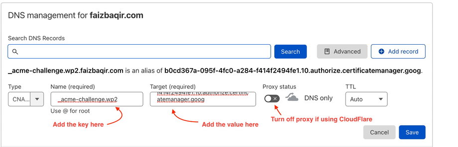 Füge auf deinem DNS-Provider einen CNAME-Eintrag mit diesen Werten hinzu.