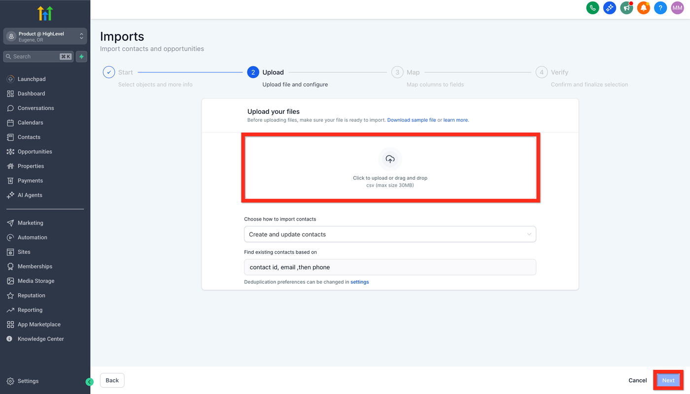 Lade deine Datei hoch (CSV-Dateien bis zu 50 MB). Um eine Beispieldatei mit standardmäßigen Contact Fields herunterzuladen, klicke auf Sample File herunterladen.