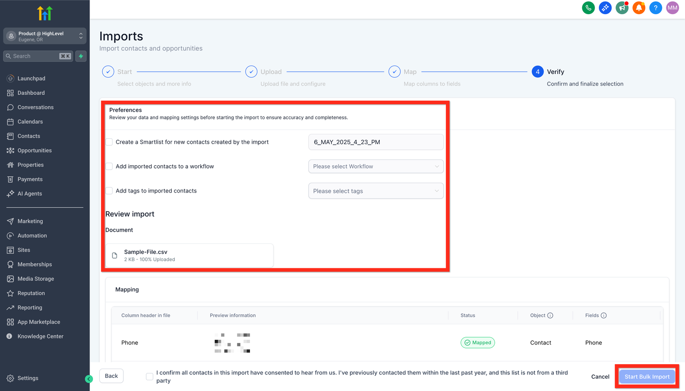 Fülle die Importdetails aus (benenne deinen Import, erstelle Listen, lege Consent-Einstellungen fest usw.) und klicke auf Bulk Import.