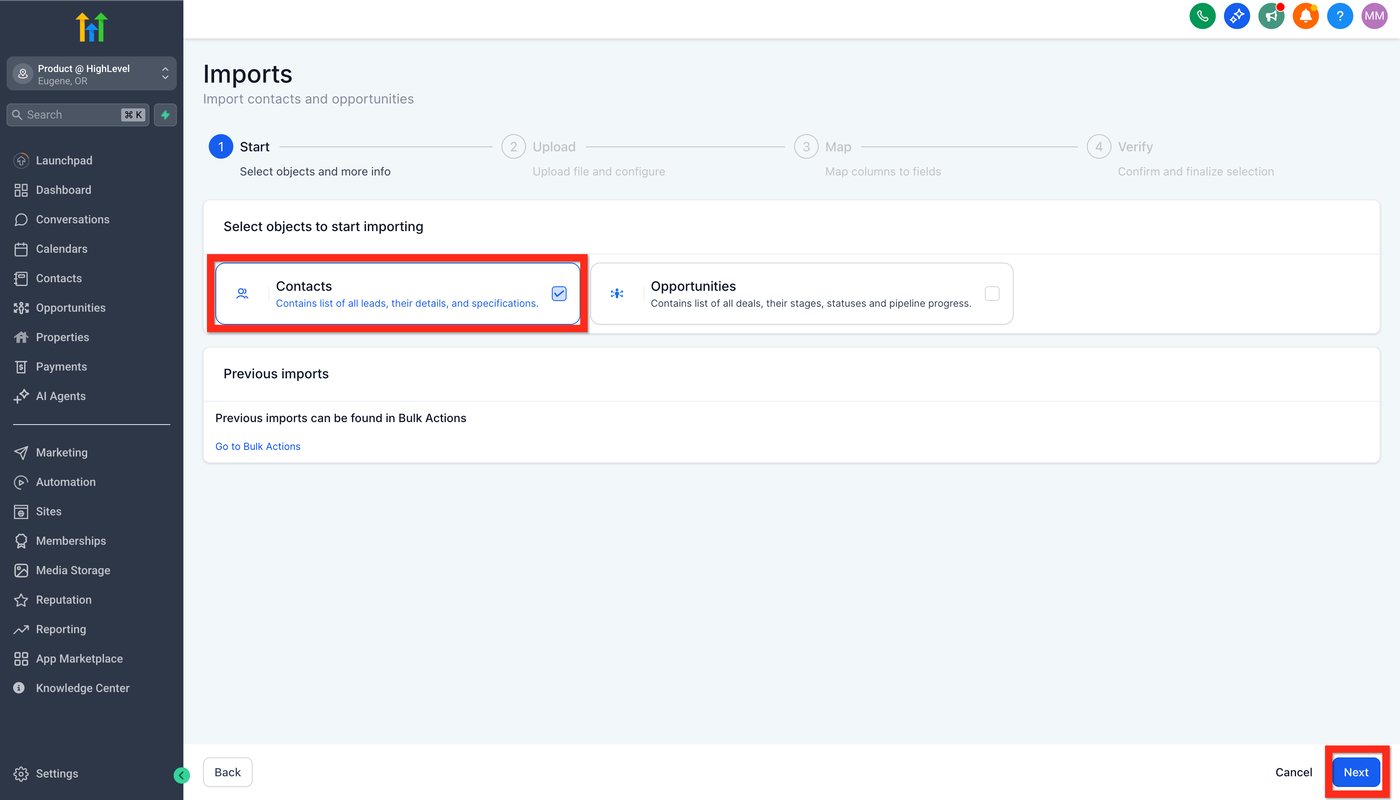 In Imports-1 wähle Contacts und klicke auf Weiter.