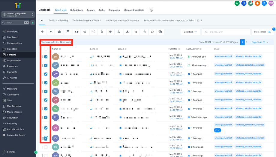 Klicke auf eine Bulk-Action-Schaltfläche (z. B. Add to Automation, Send SMS, Send Email).