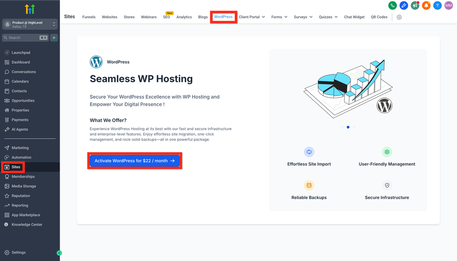 Klicke zuerst auf Sites > WordPress. Damit bist du auf dem richtigen Weg, um ein neues Zuhause für deine bestehende Website zu erstellen.